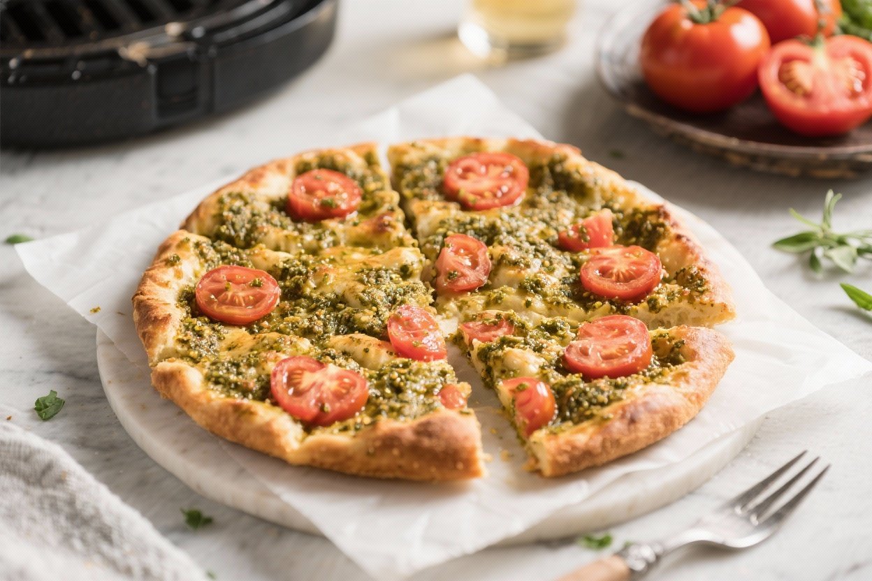 Tomato and pesto add flavor without extra steps. Cherry tomatoes roast and sweeten as they cook, and pesto melts into the dough, almost like a built-in sauce. You don’t need a pizza stone or special pan—just a parchment-lined air fryer basket or a small cake pan that fits.