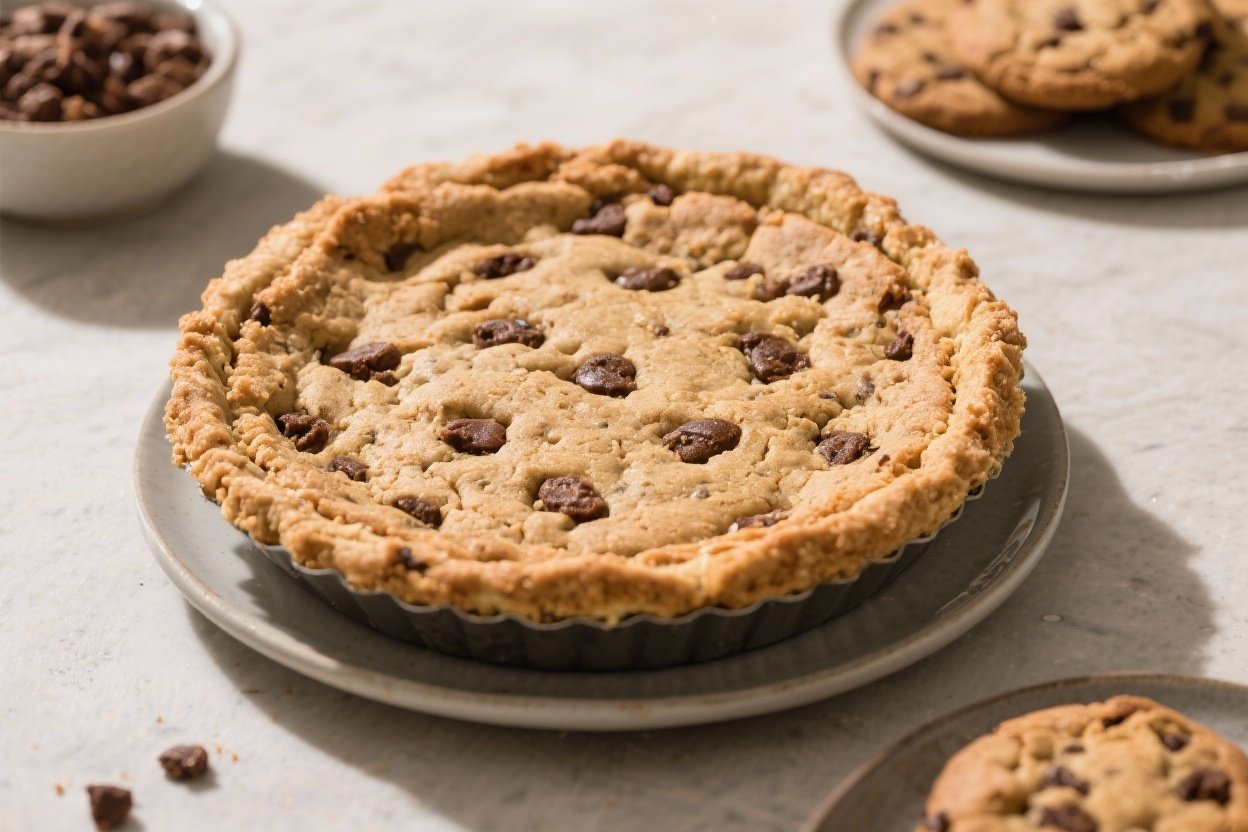 - Rest and finish: Let the cookie pie cool in the pan for at least 10–15 minutes so it sets. Sprinkle with flaky sea salt if you like. Slice warm or at room temperature.