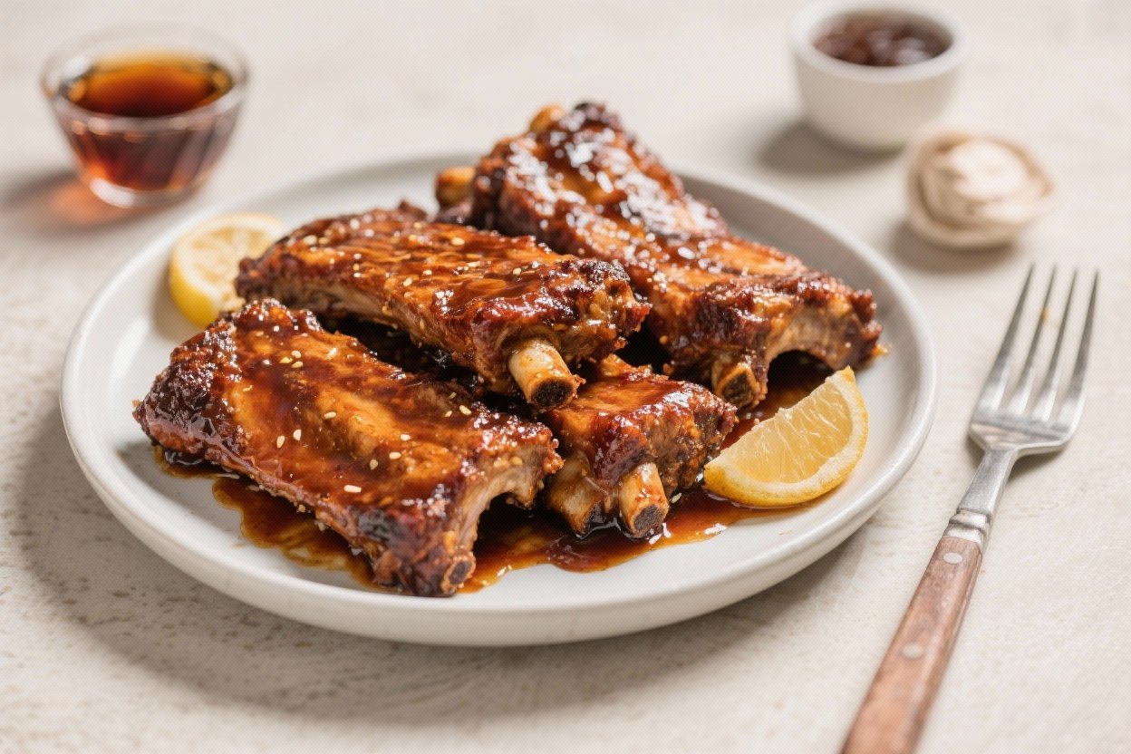 Final plated dish: Restaurant-quality presentation of brandy-and-Coke pork ribs stacked on a wide wh