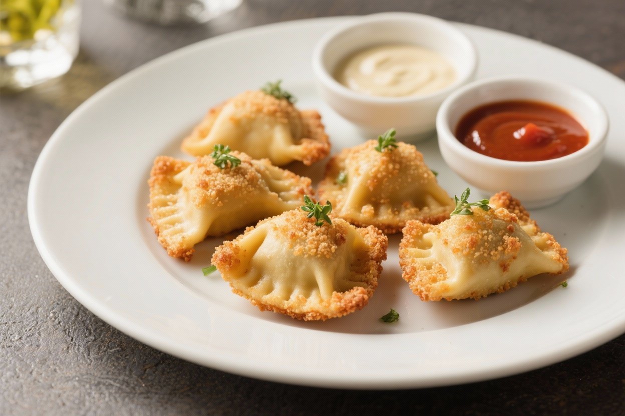 Agnolotti is pure comfort—pillowy pasta filled with ricotta or meat, usually simmered in sauce. But here’s a fun twist: crumb it, air fry it, and serve with two bold sauces for dipping. You get a crispy, golden shell with a soft, creamy center, and a plate that feels like a restaurant snack without the deep fryer.